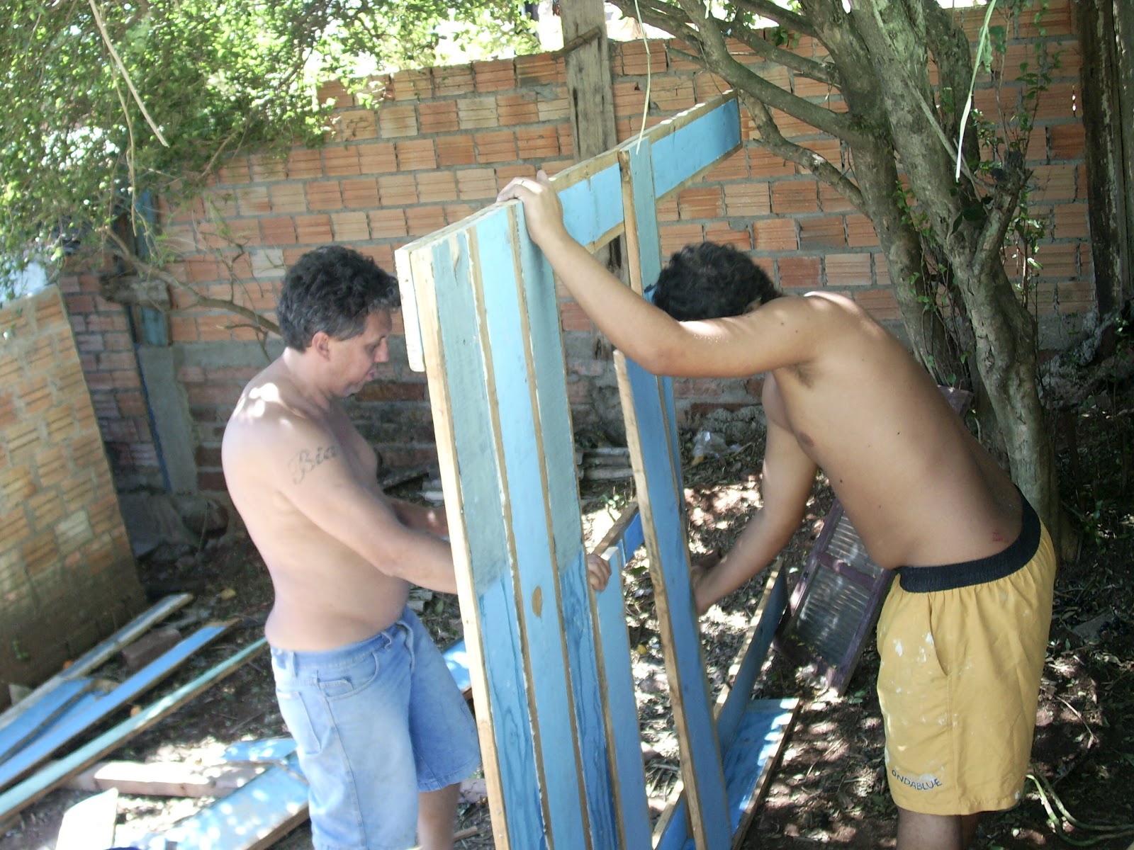 Compramos um terreno que tinha nos fundos da nossa casa ,e lá tinha uma casa velha que foi desmanchada, pretendemos fazer um quiosque e uma piscina futuramente...e com as tabuas melhores meu marido está fazendo uma casinha pra Dudy hoje ele teve a ajuda do meu filho Jeisom!